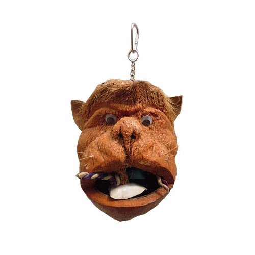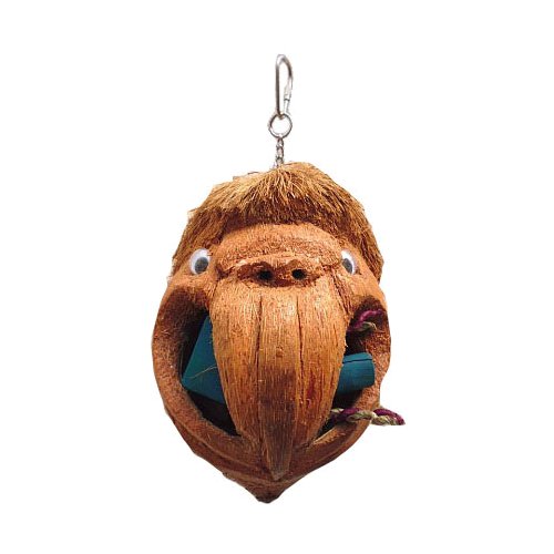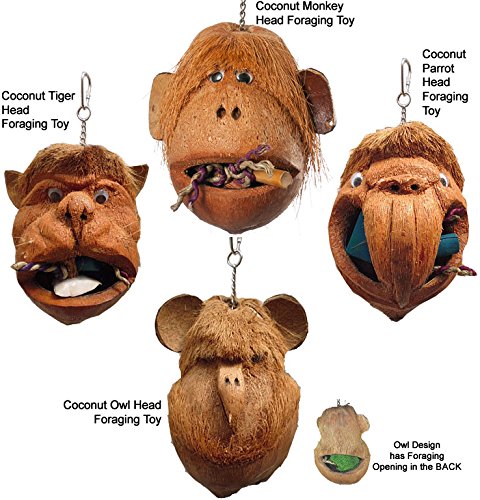 -. Feature : This Foraging Chew Toy perfectly suited for parrots of the size of Conures, Amazon Parrots, African Greys, up to the largest Cockatoos and Macaws. If space allows, this Cocohead will also provide hours of entertainment to a group of pocket parrots, such as lovebirds and parrotlets. It's a natural cavity that they are likely to nest and roost in. / When empty, will also function very well as a cute "Roosting Hut" for small finches and even smaller parakeets will want to explore the inside of this toy and probably end up roosting or nesting in it for a season or two / This hollowed out coconut is a sturdy, durable and entertaining. The head / mouth is filled with small foot toys, wood blocks and cuttlebone. You can increase your pet's fun even more by hiding in it your pet's favorite toys and treats. / Made from a real natural coconut. Non-toxic and Eco-Friendly: made using natural renewable, recycled, earth friendly materials / Size: Approx. 6" x 6" x 6" ... Pear link hanging attachment included.