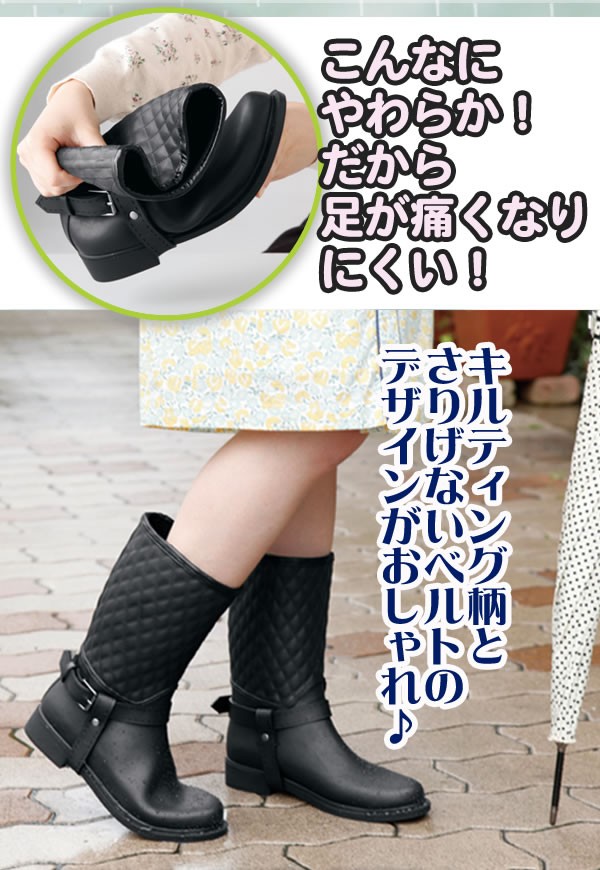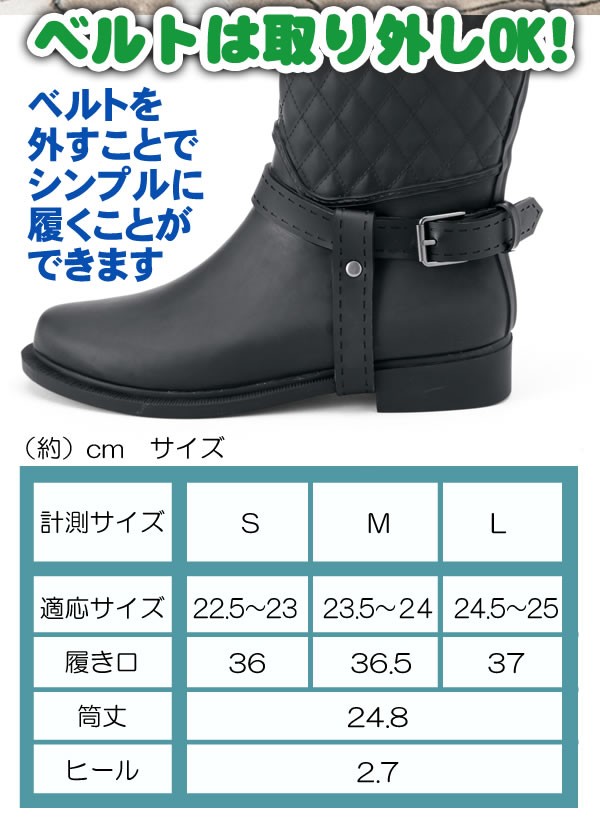 | 天然ゴムで作ったレインブーツだからとっても柔らかくフィット感バツグン!キルティング柄とベルトのデザインがおしゃれな晴雨兼用のレインブーツです!ベルトは取り外してシンプルに履くこともできます。 |