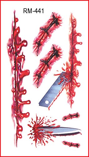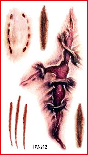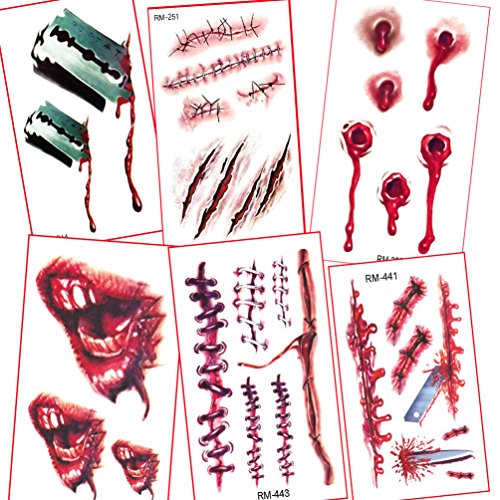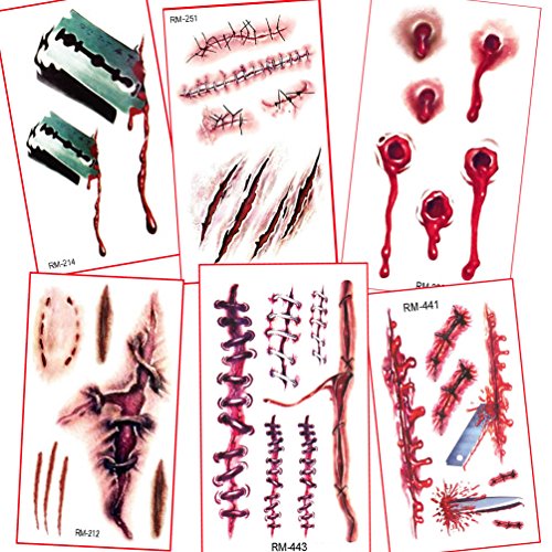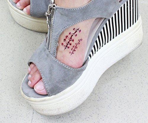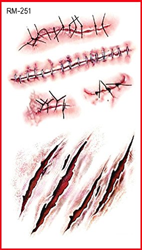 -. Feature : It's very realistic. Great trick to astonish and scare your friends, men women halloween costume funny 3d scar decal face body art makeup / Scars seem very true and natural, Attached to the waist, chest, neck, arms, back, legs, bikini, paste any position you like. Avoid rub after applied / Temporary Tattoo last 3 days according to the position you stick it / Kindly Note: The size of sheet is about 4.1in X 2.3in. / Package include: 6 sheets of temporary tattoo. Easy to use, good viscosity