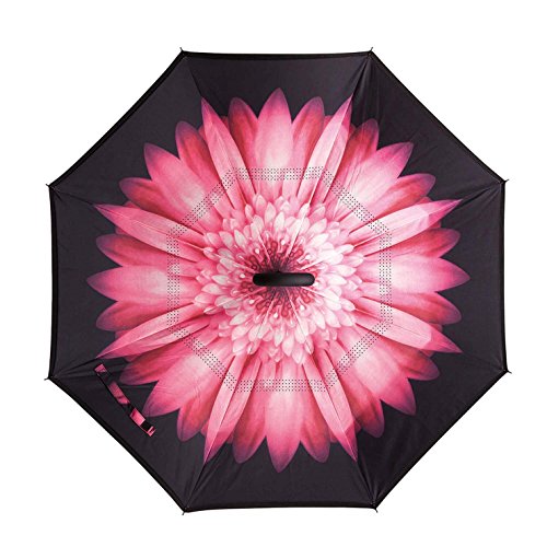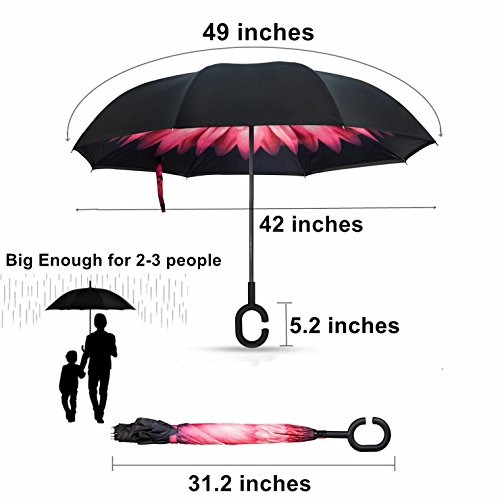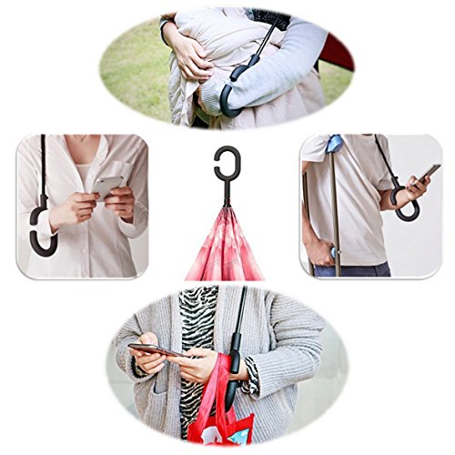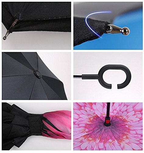 -. Feature : 1. Sturdy Quality. The framework is solid and the stitching is durable enough. Even in heavy rains and windstorm, it will never pop off. / 2. Perfect Gift. Gorgeous inverted design, beautiful patterns and assorted colors. Also with black gift carrying bag. it is very nice to have the bright patterns to look at when it is open / 3. After closing it, the raindrop on the cloth will be folded inside, so keep your car and room dry. Also great for getting out to the car, just stick it out a small gap in the door, push up and step out while opening the door and stay dry. / 4. It stands on its own and doesn't need to lean on a wall or anything when it's out down. / 5. Hands Free. C shape handle release your hands. Convenient for cellphone use or holding things in hands.