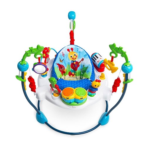 Studio : Baby Einstein Publisher : Baby Einstein Binding : Baby Product Product Description Make beautiful music together with this Baby EinsteinTM Activity Jumper that's loaded with engaging musical activities that will keep your little composer entertained. The Neighborhood Activity Jumper offers electronic bongo drums with lights, sounds and multiple languages. This musically magnificent toy station removes so baby can play with it anywhere. Little hands can explore a caterpillar with spinning beads, a piano that spins and makes fun sounds, a guitar with colorful beads that spin and jump, a tambourine-shaped mirror for self-discovery and so much more! Four height positions keep baby's growing legs comfortable and the Secure SupportTM Seat adds height and padding for better support. The seat rotates a full 360 degrees to give baby easy access to all the fascinating Baby Einstein toy stations. All this, in a space-saving design. 0