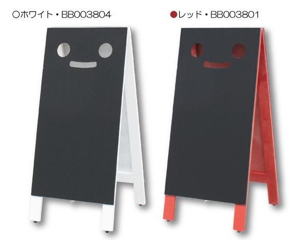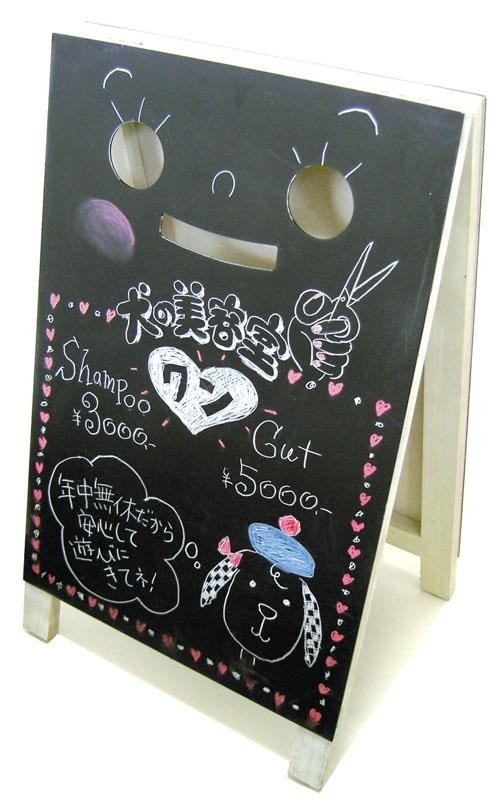 前面が顔になっており、書き方やアレンジ次第で様々な表現ができるインパクト大のブラックボードです。背面はフラットなので、全面を使ってより多くの情報を書くことが可能です。 |