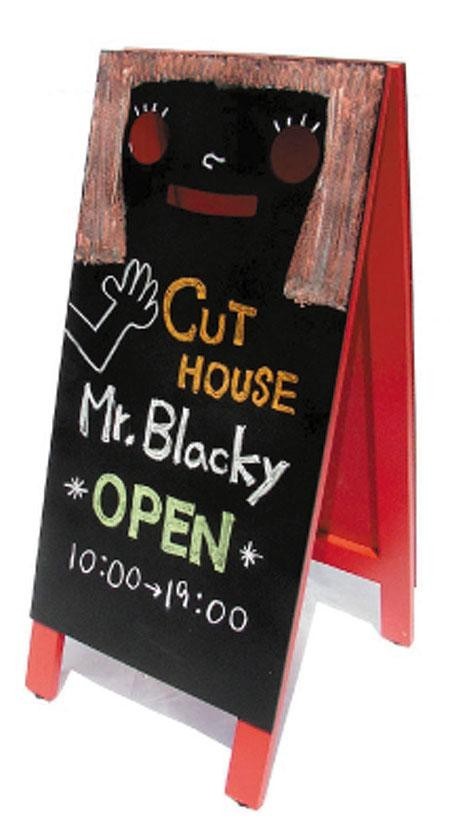 | 前面が顔になっており、書き方やアレンジ次第で様々な表現ができるインパクト大のブラックボードです。背面はフラットなので、全面を使ってより多くの情報を書くことが可能です。 |