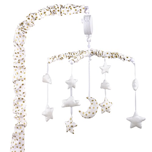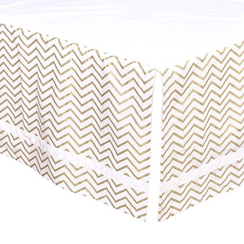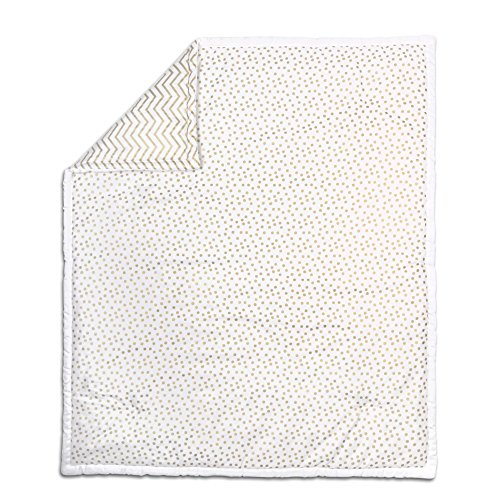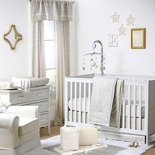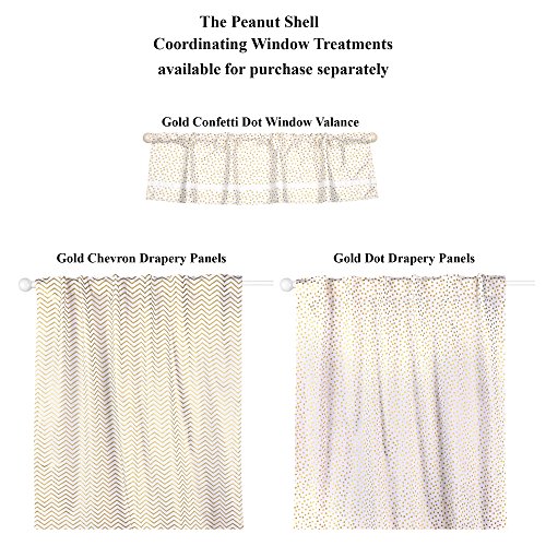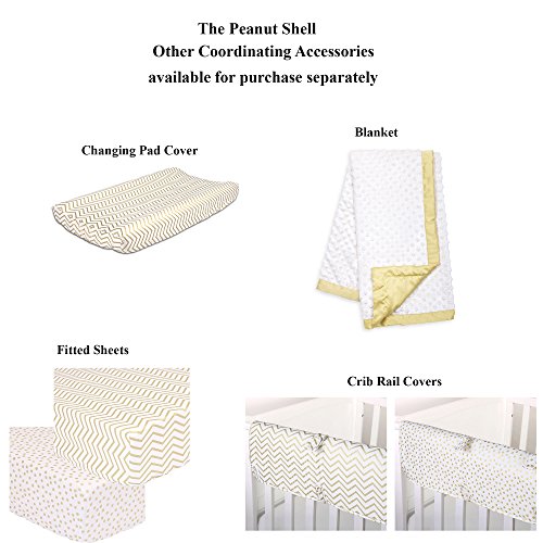 -. Feature : 100% cotton sateen fabrics highlight this premium quality combination of gold confetti dot and zig zag; 5 piece set includes reversible quilt, reversible bumper, white fitted sheet, tailored chevron dust ruffle, and musical mobile; individual components of this set are also available for purchase separately / Generously sized at 44 by 37 inches, the 100% cotton quilt will find a host of uses in and out of the nursery, inside and outside the home; perfect for tummy-time / Crib skirt, with a 14 inch drop, and the fitted crib sheet are designed to fit a standard sized crib with a mattress measuring 52 by 28 inches; all-around elastic will assure that the sheet fits safely and securely every time / Reversible 4-piece bumper provides numerous decorative options - face them all in the same direction or mix them up to create your own unique look; musical mobile features moon, clouds, and stars and plays a gentle lullaby to soothe baby to sleep / The Peanut Shell, through this mix and match collection, offers a host of coordinating items for your nursery, including: window treatments, crib rail guards, blankets, alternate sheets, and changing pad covers