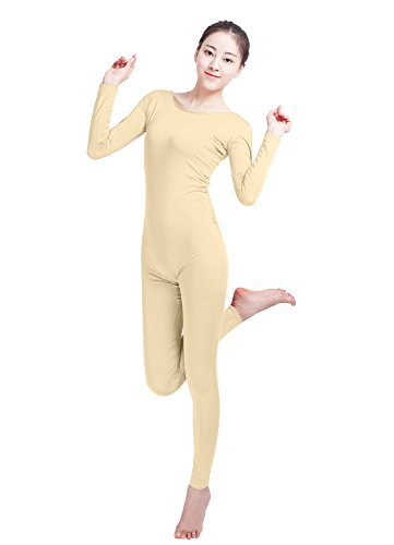 One piece unitard with long sleeves, long pants, and scoop neckline, no zipper.