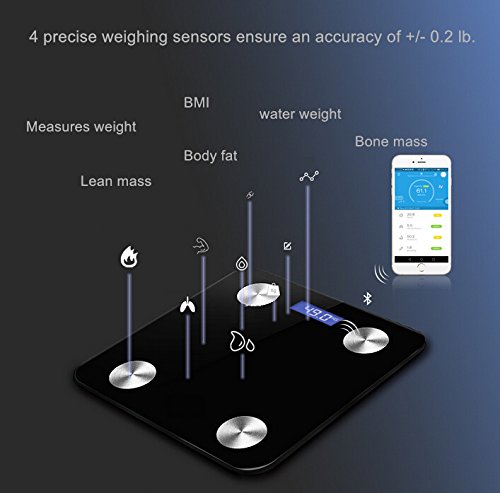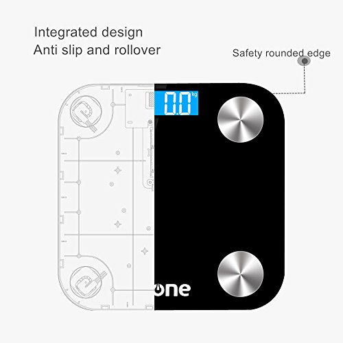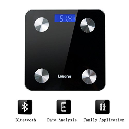 -. Feature : APP monitor--The Leaone APP monitor health change at any time,which can record your weight change.(Support IOS&Android)With the ITO layer,the scale can get your body data,such as BMI,water(%),muscle(%),bone(%) ITO layer provides a metal-less surface and higher sensitivity Accommodate up to 8 Family Members and Keep Data / Respectively: This BMI scale APP tracks and records every measurement for you, creates tables, lists, and graph display options / CLEAR RESULTS--Vivid blue backlight display for clear readability in any light setting with Auto on/off,Low battery and overload indication / Power Saving-- High-performance world class chips,which is low power consumption,fast caculation and weighing accurately. Included with 4pcs of 3 AAA battery / WARRANTY:100% CE Satisfaction Guarantee for 1 year and refund without question in 15 days