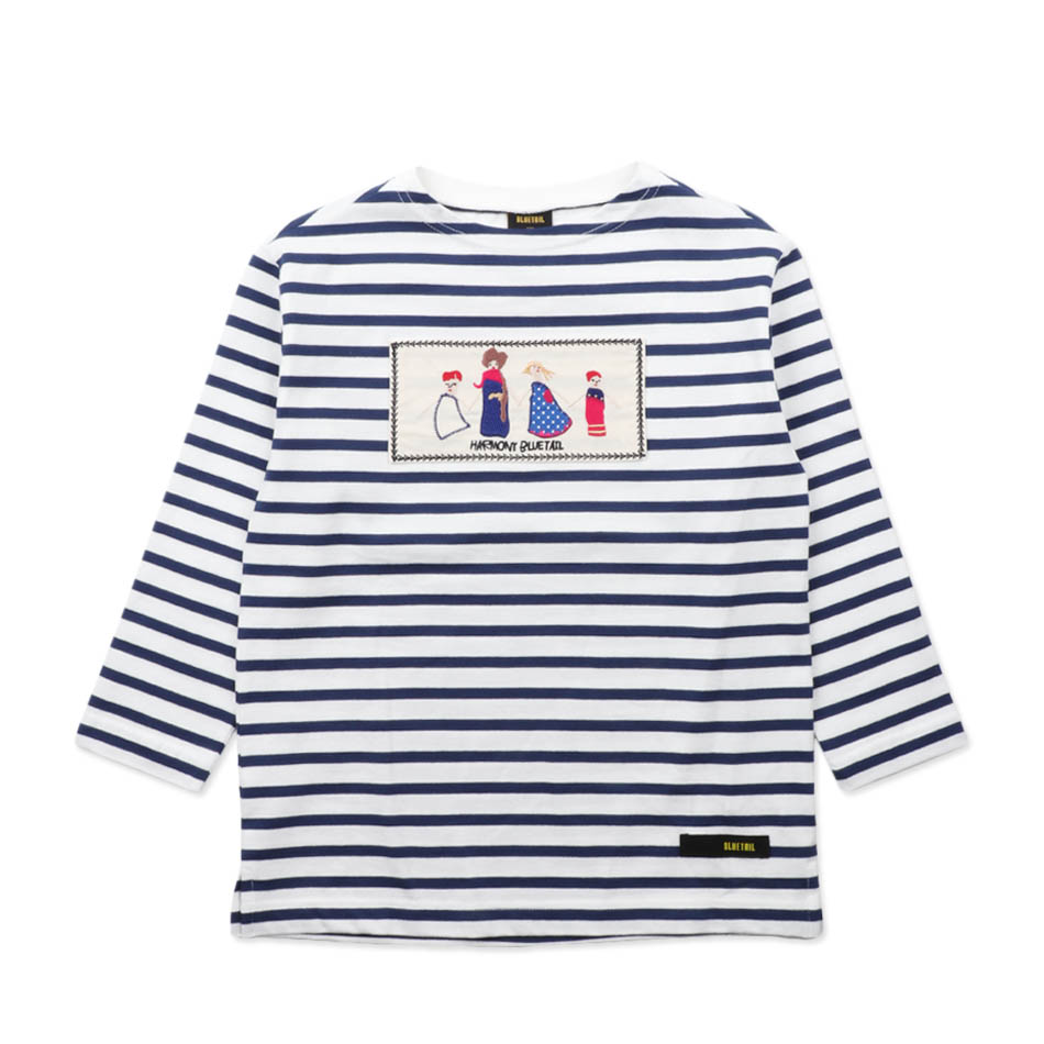 블루테일 로열티를 보여주는 스트라이프 위에 손에 손을 잡은 모양의 자수 패치로 하모니에 대한 이야기를 크래프트하게 표현했습니다.