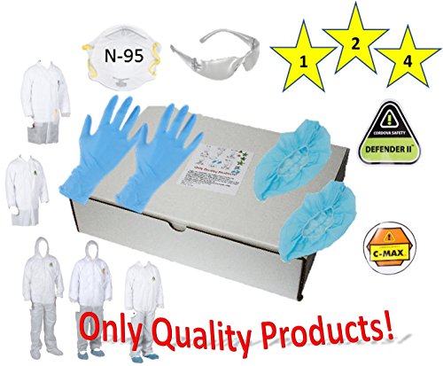Zip front closure, elastic waist, wrists, and ankles, full foot protection, and a hood bundle with N-95 mask, Safety Glasses, Allergen, latex, and powder free 4 mil Gloves size Large