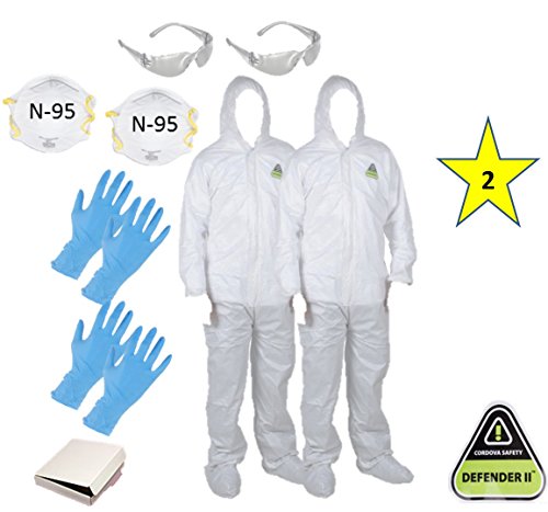 MP-400 ( L)(Two) CORDOVA DEFENDER II White Disposable Suits Microporous paint Coveralls with Hood and Boots + 2 N-95 Masks + 2 Safety Glasses + 4 Gloves size L