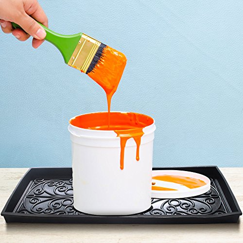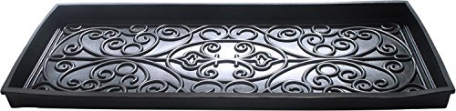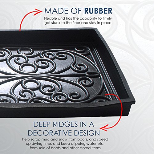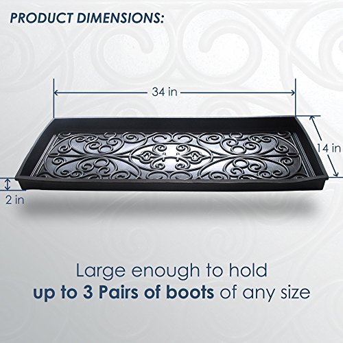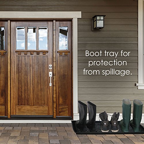 With its large containment area, this 34 x 14 inches rubber tray can hold 3 boots of any size. The raised edges prevent spills. Use the deep ridges to scrap mud and snow from shoes. Put it in the mudroom or entrance to hold wet boots and umbrella to help water drip off quickly and speed up the drying time.