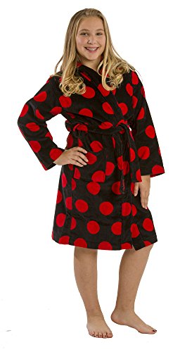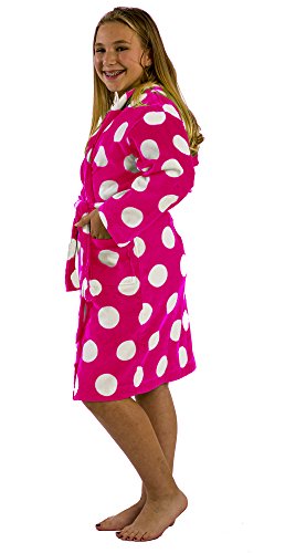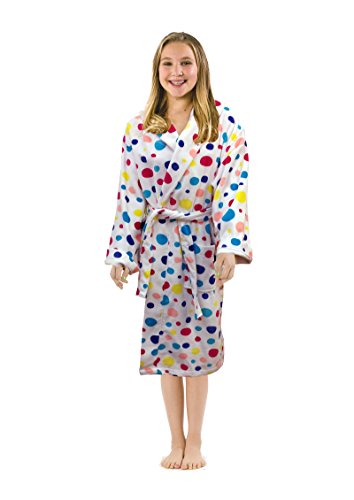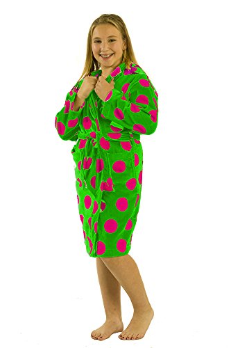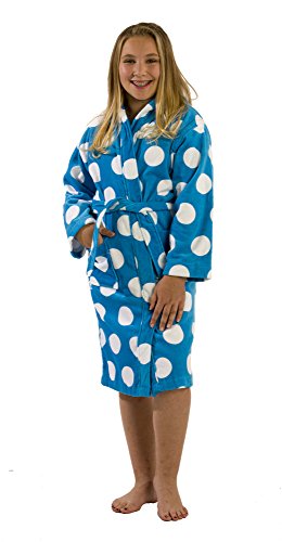 Fiber reactive printed terry velour kids robes are made in five vibrant polka dot colors with full length sleeves.