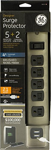 GE 30572 Surge Protector, 5 Outlets, 1200J, 4' Cord, USB, Brushed Nickel