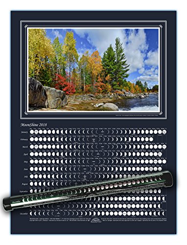 MoonShine Lunar Calendar 2018 is a moon calendar with the daily phase, dates of full moon, new moon, first quarter, last quarter, apogee, perigee, supermoons, blue moons, equinoxes, solstices, names of full moons. Our "Landscape" photo edition is the stunning wall graphic that you've seen in offices, homes, classrooms, yachts and more. Printed with special reflective inks and a technique that allows the scenic photograph's water and sky to take on a natural quality. Grid section shows the daily phase of the moon. The entire day-by-day, month-by-month array creates an eye-catching effect. Times of the New moon, Full moon, and Quarter phase moons shown. Included MoonWatcher guide contains articles related to eclipses, apogee/perigee, blue moons, etc. MoonShine is a winner in both the National and World Calendar Awards. Size 17.75" x 23.75" (fits 18" x 24" frame). Rolled in a clear Gift Tube with end caps. Printed in the USA on quality recycled paper.Feature