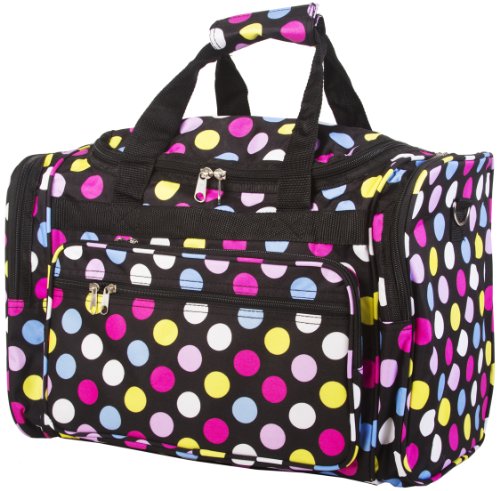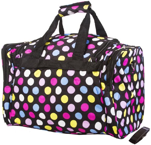 -. Brand : World Traveler -. ClothingSize : 19-inch -. Color : Polka Dot - Colorful -. Department : womens -. EAN : 0702472380535 -. Feature : Adjustable, detachable non-slip padded shoulder strap / U-top opening provides easy access to roomy zipper secured main compartment / Metal feet allows stabiity to bag when setting down and provides bag floor not to touch floor directly to get dirty / Front exterior zip pocket with two exterior end zip pockets / Silver pewter hardware -. Model : T19-636 -. MPN : T19-636 -. NumberOfItems : 1 -. PackageQuantity : 1 -. PartNumber : T19-636 -. ProductGroup : Apparel -. ProductTypeName : LAGE -. Size : 19-inch -. Title : World Traveler Colorful Polka Dots Duffle Bag 19-inch -. UPC : 702472380535