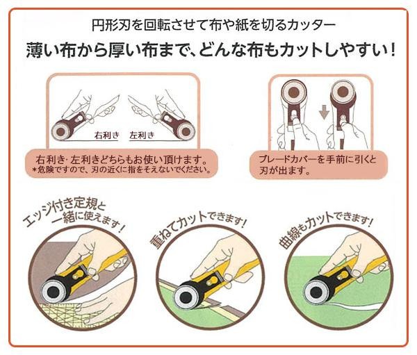 fk094igrjs布逃げしやすい薄地やバイアス、曲線など自在にカットします サイズ W4.8×H14.7×D1.8cm 個装サイズ:8×22×2cm 重量 約63g 個装重量:76g 素材・材質 タングステン鋼、プラスチック 仕様 替刃式、左右両用、直径45mm刃 製造国 日本 切りにくい素材も自在にカット ※モニターの設定などにより、実際の商品と色味等の見え方が異なる場合がございますあらかじめご了承ください 布逃げしやすい薄地やバイアス、曲線など自在にカットします