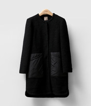 大胆地拼接与圈状毛呢完全相反肌理效果的细腻聚酯纤维,