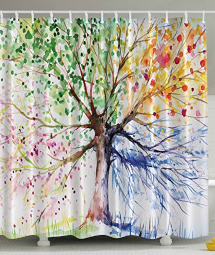Colorful Tree Four Seasons Shower Curtain, Berry Green Red Yellow Navy Brown, Extra Long Bath Decorations Bathroom Decor Sets with Hooks Marriage Gifts for Men and Women in Art Print Polyester Fabric