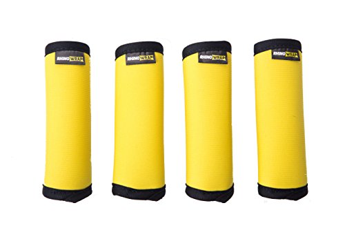 -. Feature : ID your bag. / Protects your hand. / Stretches to fit any bag handle. / Bright yellow color helps distinguish your bag. / Sewn in "Rhino Wrap" label adds name-brand recognition.