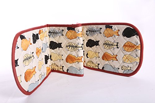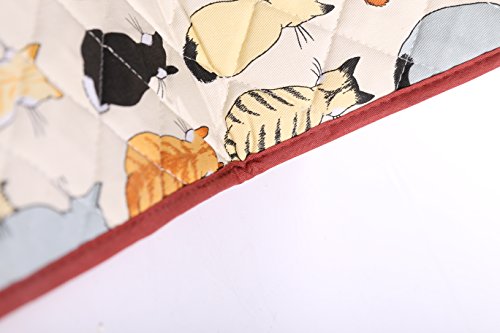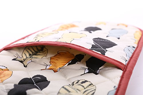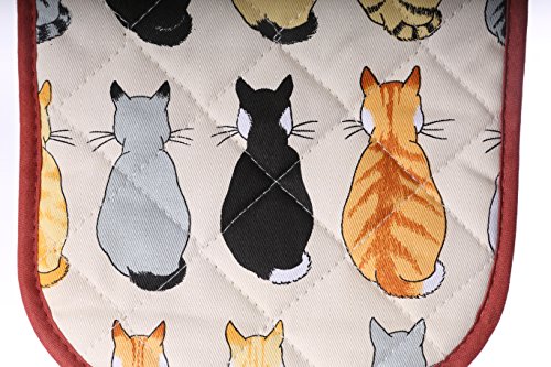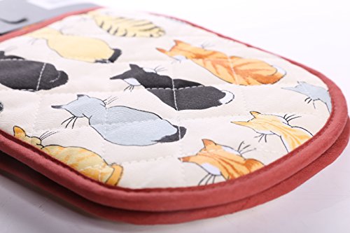 - Kitchen linen set contains: one 13" oven mitt, two 7" pot holders, and two 15" kitchen towels
