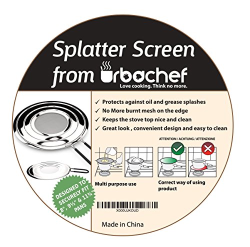 - Feature : WHY SPEND HOURS CLEANING THE KITCHEN? With one of our splatter screens for cooking, you won't end up with splatters all over the stove & walls! The splatter guard kitchen tool makes clean-up after meals as easy as washing the screen / DURABLE, SAFE CONSTRUCTION 201 stainless steel fine mesh splatter screen keeps grease & messes contained with ease; The steel construction ensures that the splatter guard will not burn on a gas stove & that it's strong enough to last through thousands of uses / EASY TO GRIP HANDLE Silicone splatter screen handle is highly heat resistant, and the ergonomic design makes the splatter screen silicone easy to grip / PERFECT SIZE Splatter screen for frying pan cookware measures 30 cm (11.75 inches) in diameter with grooved 24 cm (9.5") and 20 cm (8") rings, so the splatter guard screen will fit securely most pots and pans / SATISFACTION GUARANTEED Urbachef is committed to offering only the best splatter guard for frying pans on the market today! If you're not completely satisfied with our grease splatter screen within 30 days of your purchase, we'll refund your money