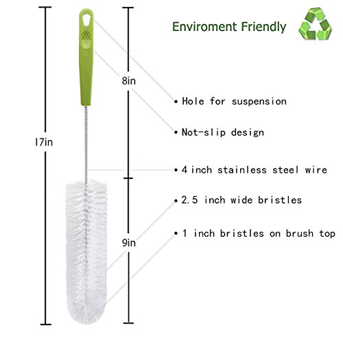 - LONG & WIDE BOTTLE BRUSH WASHER: 17" extra long brush + 2.5" diameter easily washes the inside of beer, wine, kombucha, carafes, decanter, stainless