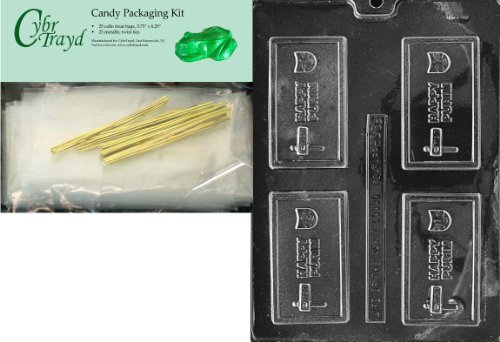 Cybrtrayd "Happy Purim" Business Card Chocolate Candy Mold with Packaging Bundle of 25 Cello Bags, 25 Gold Twist Ties and Chocolate Molding Instructions