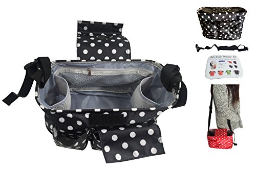 1.Universal design measuring 30*15*21cm(11.8*6*8.3in).? 2.Fits most strollers using adjustable buckle sturdy straps.? 3.2 side drink holders, middle compartment for diapers, snacks, wallet, and small toys.? 4.3 outside pockets for wipes, keys, mobile phones, ear phones etc. 5.Velcro closure on the main compartment to help prevent loss of valuables from spillage or theft.?Zipper. mesh pouch inside is perfect for loose change or other small items.? 6.Premium high quality polyester material that can be wiped and cleaned, keeping your organizer clean.? 7.Lightweight but strong material that won't tip over your stroller.? 8.Shoulder strap come together with the bag, work as stroller bag or a shoulder bag. 0
