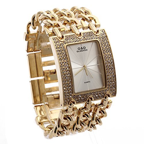-. Title : G&D Women's Gold-Tone Triple Chain Stainless Steel Band Rhinestone Luxury Analog Wrist Watches