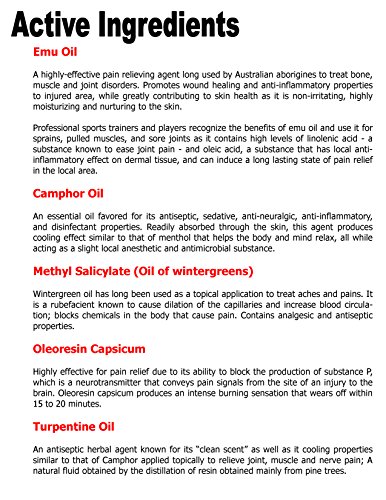 -. Feature : Provides fast relief to sore muscles and joints; Improves circulation; Speeds up recovery. / Long lasting relief for: Bruises, Sports injuries, Tension, Inflammation, Arthritis and Tendonitis. / #1 source to help warm up and minimize cramping which can affect performance in athletes. / A perfect blend of Oil and all-natural active ingredients to alleviate pain and soreness. / See why we are converting users of Biofreeze, Bengay, Tiger Balm, Icyhot, Deep Blue and Penetrex
