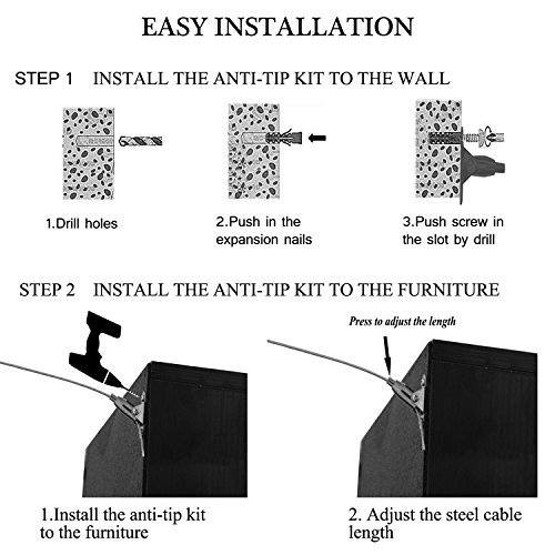 PRESS DESIGN AND ADJUSTABLE - The cable of these anti-tip kit is easy adjust length in accordance with your need by particular press design. Shorten the steel cable length by easy do, but elongate steel cable length [Maximum elongate length is 12.5"] must by this press design, more convenience and increase safety