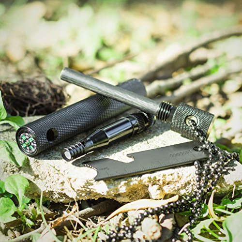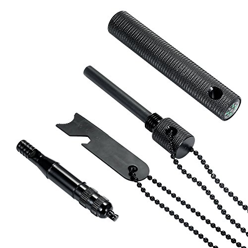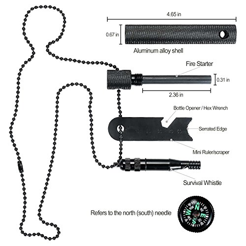Magnesium Survival fire starter Complete All-in-One kit: magnesium fire starter rods, multifunctional scraper, compass, whistle and metal strap.