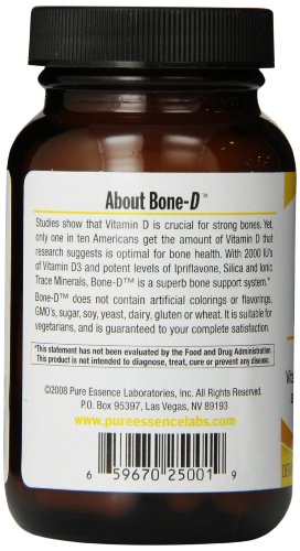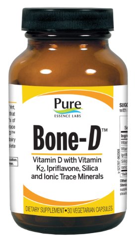 -. Binding : Health and Beauty -. Brand : Pure Essence -. EAN : 0659670250019 -. Feature : Vitamin D3 is best known for its critical role in bone health - Research has shown that adequate levels of D3 also support healthy blood sugar levels and protect the health of the breast, prostate, bowel and cardiovascular system / Vitamin K2 - Plays a crucial role in the management of calcium deposition in bone / Ipriflavone - May increase bone calcium retention, inhibit bone breakdown, promote activity of the bone-building cells in post-menopausal women and does not have estrogenic activity like other Isoflavones / Bamboo Leaf Extract - Plays and imprortant structural role in bone tissue / All Authentic Pure Essence Labs Products Are Shipped With A Certificate Of Authenticity And The Manufacturer's Seal Of Approval -. IsAdultProduct : 0 -. Label : Pure Essence -. Manufacturer : Pure Essence -. Model : 659670250019 -. MPN : 659670250019 -. NumberOfItems : 1 -. PackageQuantity : 1 -. PartNumber : 659670250019 -. ProductGroup : Health and Beauty -. ProductTypeName : HEALTH_PERSONAL_CARE -. PublicationDate : 2011-04-13 -. Publisher : Pure Essence -. Size : 30 -. Studio : Pure Essence -. Title : Pure Essence Labs Bone D - Vitamin D3 With Vitamin K2 - Ipriflavone - Silica - Ionic Trace Minerals - 30 Vegetarian Capsules -. UPC : 659670250019