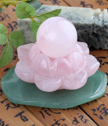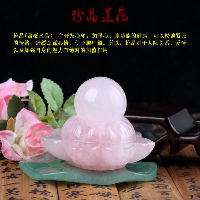 此款莲花摆件由手工打磨而成.质地细腻温润、饱满、色泽靓丽、独特、富有生气。 粉水晶主开发心轮,加强心肺功能的健康。可松弛紧张情绪,舒缓烦躁心情,协助深入内心,发现自我提高悟性。