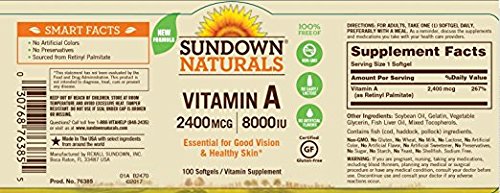 Sundown Naturals Vitamin A provides you with an essential nutrient that helps maintain the health of your eyes and skin. One easy-to-swallow softgel a day is all you need to support a healthy immune system. Plus, just one softgel a day provides you with a high-potency source of this essential vitamin from retinyl palmitate. Vitamin A is also essential for new cell growth and healthy tissueFeature
