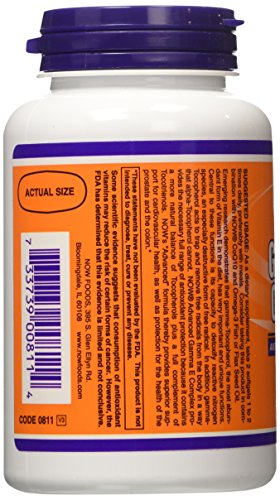 Emerging research demonstrates that gamma-Tocopherol, the most abundant form of Vitamin E in the diet, has very important and unique functions. Central to these functions is its capacity to detoxify reactive nitrogen species, an especially destructive form of free radical. In addition, gamma-Tocopherol acts to trap and remove free radicals from the body in a way that alpha-Tocopherol cannot. NOW Advanced Gamma E Complex provides the necessary full range of antioxidant protection because it contains a more natural balance of Tocopherols plus a full complement of Tocotrienols. NOW Advanced formula thereby provides superior support for cardiovascular health, as well as protection for the health of the prostate and the colon.* From the FDA's website: Some scientific evidence suggests that consumption of antioxidant vitamins may reduce the risk of certain forms of cancer. However, the FDA has determined that this evidence is limited and not conclusive.Feature