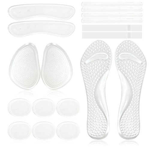 QUALITY MATERIAL - All 18 pieces gel insole inserts are made from a soft, cushioned transparent silicone. Including : 2 ball of foot cushions ,2 heel liners grip pad , 6 random round dot stickers, 2 seven length gel insole inserts ,2 Transparent Invisible Shoe Straps ,4 Slim heel cups.