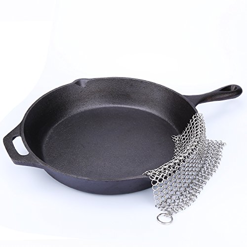 -. Feature : Smaller rings in a larger 8 inch by 8 inch size! Larger than the other similar products in the market, save much time for you! The Small Ring Chainmail Scrubber - Makes Cookware Cleanup Quick and Easy. / Will Not Scratch Your Pans. Keeps Your Cast Iron Seasoned,The Small Ring Scrubber does the job with just warm water. And the hand made chainmail design means that only the round ring edges touch the pan. / Each Ring Hand Formed for Smoothness, Strength and Comfort. Manufactured with Restaurant Quality 316 Grade Stainless Steel / For Cast Iron, Woks, Casseroles, Stainless Steel Cookware items like a baking sheet, tea pot, cookie sheet, cauldron, tortilla press, hibachi, cornbread, pie pan and more! Lightweight, and convenient for home, camping or travel. / MONEY-BACK Your Satisfaction is our TOP P.R.Iority.If not satisfied for any reason,please return for a 100% refund.