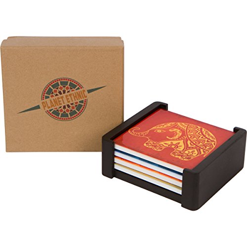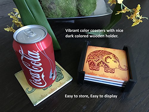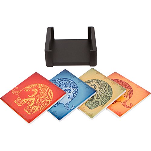 - Set of 4 designer coasters. Each coaster has same elephant design but different vibrant color.