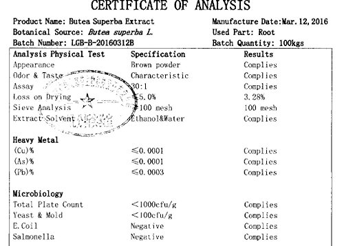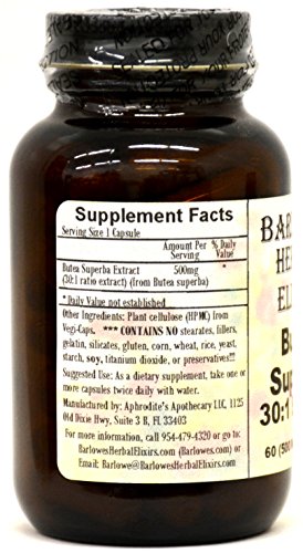 -. Feature : Butea Superba Extract Has Been Used As A Male Tonic Herb in Thailand for Centuries! / Highest Quality Extract in Vegi-Caps Which Are Kosher, Halal & Vegan Certified! / Bottled in Glass! No Stearates, No Fillers, No Gluten, No Wheat, Rice, or Corn Powders! / No Artificial Flavors, Colors or Preservatives! / Flat Rate Shipping - All of Barlowe's Products Can Ship Together At One Low Combined Rate!