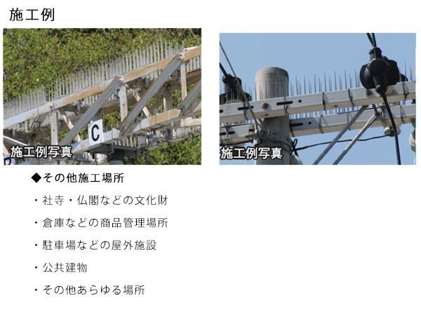 | 用途に応じて切ったり、並べたりして、ハトの集まりそうな場所に設置するだけ。迷惑なフン害を防止して、快適な生活を守ります。更に本品はプラスチック製ですので、接近した鳥を傷つける心配も無し。先端が丸くやわらかで、簡単に加工・設置できます。 |