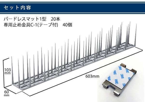 | セット内容 | バードレスマット1型×20、両面テープ付き止め金具(C-1)×40 |