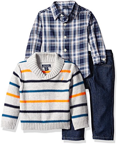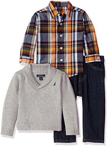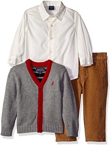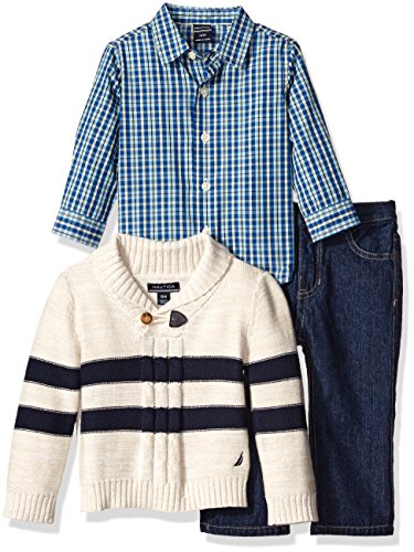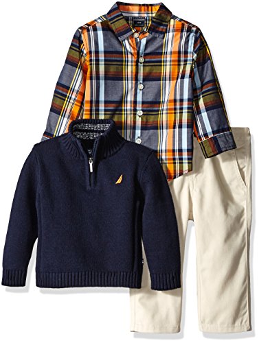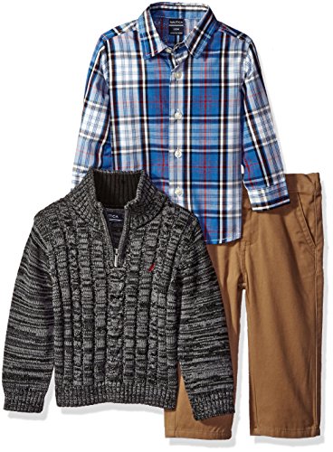Nautica three piece set which includes a woven button down shirt, a quarter zip sweater, and flat front twill pants.
