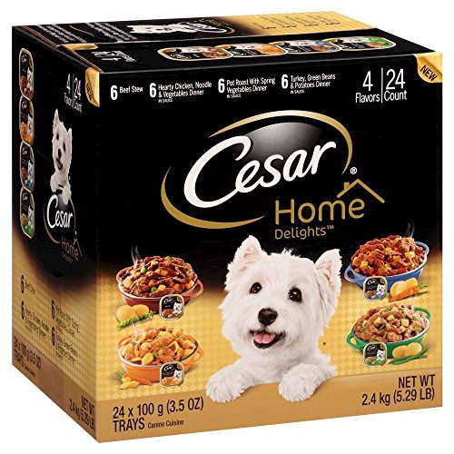 -. Binding : Misc. -. Brand : Cesar -. Feature : EACH BOX CONTAINS : Six - 3.5 oz trays Beef Stew; Six - 3.5 oz trays Hearty Chicken, Noodle & Vegetables Dinner in Sauce; Six - 3.5 oz trays Pot Roast With Spring Vegetables Dinner in Sauce; Six - 3.5 oz trays Turkey, Green Beans & Potatoes Dinner in Sauce -. Label : Cesar -. Manufacturer : Cesar -. PackageQuantity : 1 -. ProductGroup : Pet Products -. ProductTypeName : PET_SUPPLIES -. Publisher : Cesar -. Studio : Cesar -. Title : Cesar Home Delights Canine Cuisine Variety Pack - 24 CT