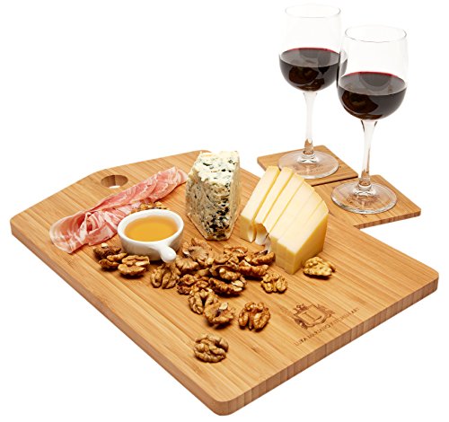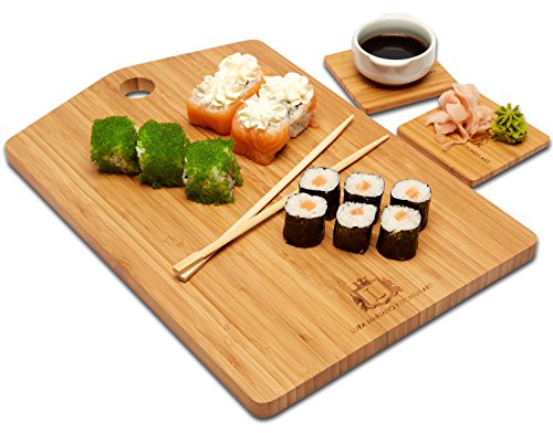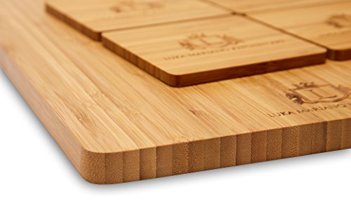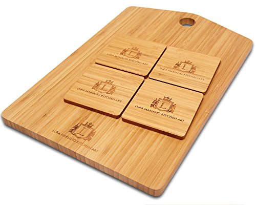 - LUXURIOUS SERVING SET: If you have a passion for elegant, carefully crafted kitchen accessories, then our product is going to blow your minds off! This unique bamboo chopping board is exactly what you need in order to impress your guests every time a big dinner comes up- serve wine, sushi and aperitifs in a luxurious way that will make everybody talk about your delicate manners! The board’s dimensions are 10x15 inches while the coasters’ 3.4x3.5 inches!