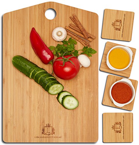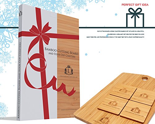 KITCHEN ART Bamboo Cutting Board - 4 Coasters Included - Easy To Clean Butcher Block - Eco-Friendly Construction - Absolute Serving Set - Large Sized Grain Board - Professional Kitchen Accessories