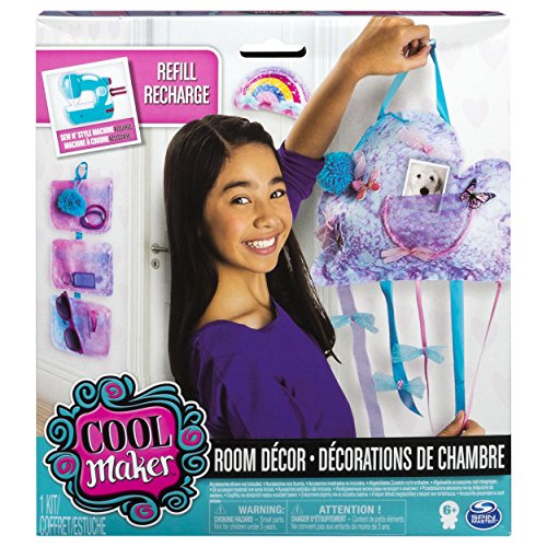 Create cool room décor with the Cool Maker Sew N’ Style Machine and the Room Décor Project Kit! The Sew N’ Style Machine (sold separately) makes it sew easy to make amazing sparkly creations that you can hang and display around your room! The Room Décor Project Kit includes enough trendy fabrics and accessories for four projects, like a colorful rainbow plush and a pretty room organizer! Customize and decorate your projects with gems, ribbons and style string, and make pom poms with the pom pom maker attachment on the Sew N’ Style Machine! Design, stitch and decorate with the Cool Maker Room Décor Project Kit and the Sew N’ Style Machine!Feature