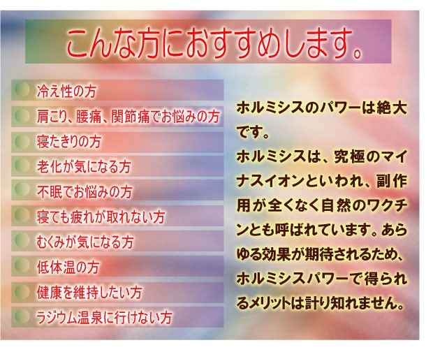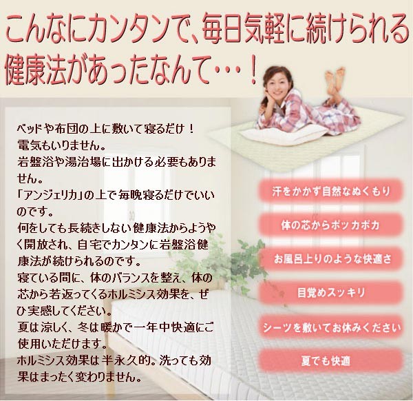 ホルミシス敷きパット「アンジェリカ」は、ベッドや布団の上に敷いて寝るだけで、あの玉川温泉のような岩盤浴気分が、ご自宅で簡単に体感できます。寝ている間に、体のバランスを整え、体の芯から若返ってくるホルミシス効果を、ぜひ実感してください。夏は涼しく、冬は暖かで一年中快適にご使用いただけます。