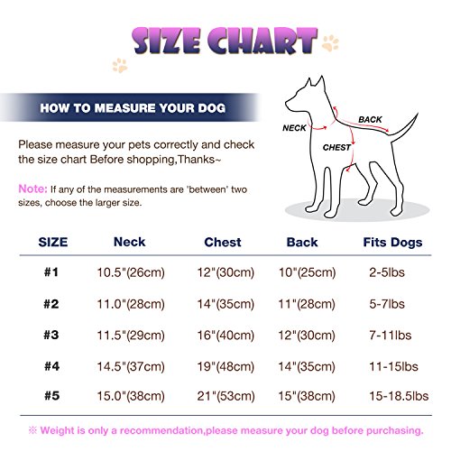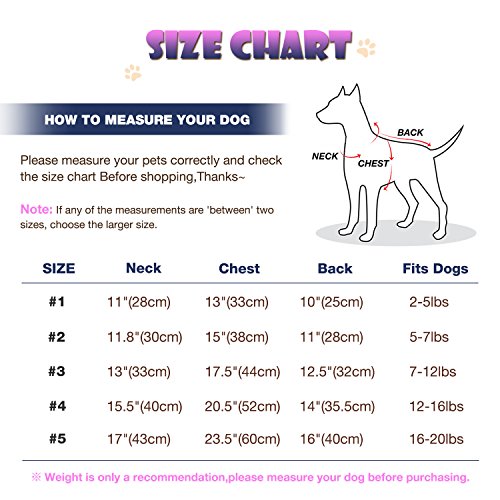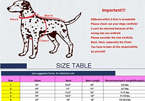 ?Feature ?Keep your furry friend warm and protected from winter weather with stylish flair ?100% polyester. Machine wash and dry. Imported. ?Great for any party competition and shows ?Easy on/ easy off with snaps ?Size:(The recommended weight just any suggestion ,please purchase according to your Pets size) 1 --Chest: 12"----------Neck:10.5"----------Back Length:10"---------- Fits dogs 2-5 lbs. 2 --Chest: 14"----------Neck:11----------Back Length:11"---------- Fits dogs 5-7 lbs. 3 --Chest: 16"----------Neck:11.5----------Back Length:12"---------- Fits dogs 7-11 lbs. 4 --Chest: 19"----------Neck:14.5"----------Back Length:14"---------- Fits dogs 11-15 lbs. 5 --Chest: 21"----------Neck:15"----------Back Length: 15"---------- Fits dogs 16-18.5 lbs. PLEASE NOTE: ?Please make sure to measure your dog for accurate sizing before purchasing to ensure the perfect fit. ?Don't worry the size run small, please choose via measurement. ?If any of the measurements are 'between' two sizes, choose the larger size. Package Included: 1 x Pet Clothes ? Anything please feel free to contact us. 0
