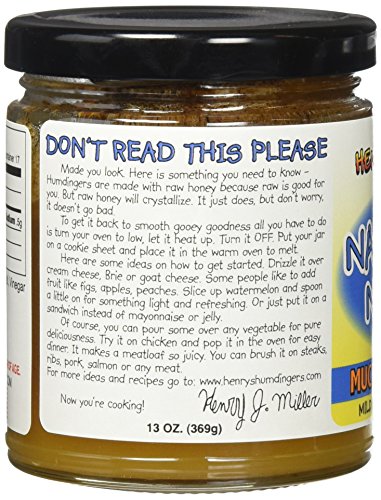 -. Binding : Grocery -. Brand : Henrys Humdingers -. Feature : Naughty nana is a mild ginger and pepper infused honey which goes well of chicken and fish / Raw honey is the only food that never really goes bad / Great in cocktails, in lemonade and your favorite tea. It is really great with peanut butter -. Label : Henry's Humdingers -. Manufacturer : Henry's Humdingers -. Model : HHNN13 -. MPN : HHNN13 -. NumberOfItems : 1 -. PackageQuantity : 1 -. PartNumber : HHNN13 -. ProductGroup : Grocery -. ProductTypeName : GROCERY -. Publisher : Henry's Humdingers -. Size : 13 Ounces -. Studio : Henry's Humdingers -. Title : Henrys Humdingers Naughty Nana - Ginger & Pepper Infused Honey,13 oz