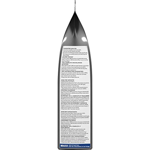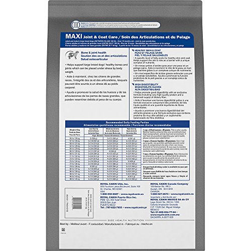 Royal Canin MAXI Joint and Coat Care supports joint health, healthy skin and coat, superior digestibility and heart health with a kibble that is easy to pick up and chew. Supplemental levels of glucosamine (780 mg/kg) and chondroitin (220 mg/kg) may help protect your large breed adult dog's joints, while essential fatty acids, found in fish oils, limit inflammation to ease the stress on joints from having increased body weight and a larger skeletal frame. Vitamins, minerals and essential fatty acids are included in this diet to protect the skins natural barrier, while Omega 6 fatty acids to help provide balanced nutrition to protect the skin and enhance the beauty of the coat. Since large breed dogs are known to have more difficulty digesting food than small breed dogs, high quality proteins and a blend of fibers, including chicken meal, sodium silico aluminate, psyllium, MOS (mannan-oligosaccharides) and beet pulp contribute to a balanced and healthy intestinal flora which means smaller, firmer stools that are easier to pick up. A balanced diet, formulated with antioxidants to neutralize free radicals, can help to protect against cell damage to support heart health. Recommended for large breed dogs weighing 56 to 100 pounds which are prone to joint and coat sensitivities between 15 months and 5 years of age. Size: 30 pounds.Feature
